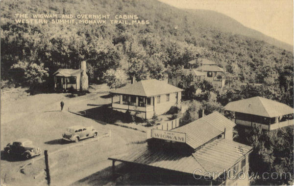 Front: THE WIGWAM AND OVERNIGHT CABINS WESTERN SUMMIT, MOHAWK TRAIL MASS. WIGWAM Back: Published by THE COLLOTYPE Co., Elizabeth. N. J. and N. Y.