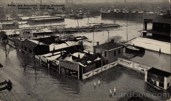 Front: Barret and Broadway, looking Northwest Louisville. -Ky. 1937 Flood COAL EUOR POINTS TO Crab Orcherd Top Back: ma Published by The Standard Printing Co., Inc. Louisville, Ky., U. S. A., 1937 CORRESPONDENCE BELOW