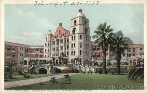 Front: Feh-24-t27-1915 11 1t 11 71676 NORTH WING, ARLINGTON HOTEL, SANTA BARBARA, CALIFORNIA Back: * PHOSTINT” TRADE MARK - REG U S. PAT OFF MADE ONLY BY DETROIT PUBLISHING CO FOREIGN TWO Feb, 24-27-1918 THIS SPACE MAY BE USED FOR MESSAGE.