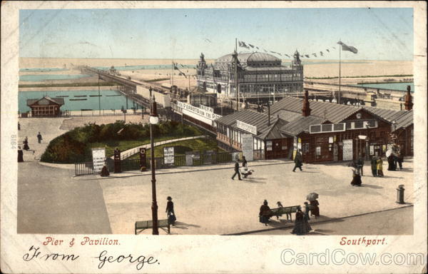 Front: JAILY AT EEP ERROTS190 tn P Southport. Pier & Pavilion. Gerom George. 5164 Back: & REVENUE POST CARD - GREAT BRITAIN & IRELAND ORI OUTRA DIHAL PENS Miss £ L Millington 10 Hartwood Road Bisktale Southport