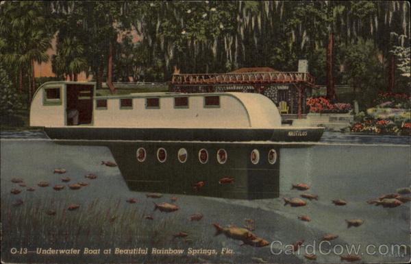 | Enjoy Rainbow Springs, Florida's **** Attraction, on US Highway 41, just north of Dunnellon. 547 million gallons of crystal clear water flow daily forming the gigantic springs, in which are Florida's most spectacularly colorful underwater gardens and marine life; shown thru new underwater view and submarine boats |