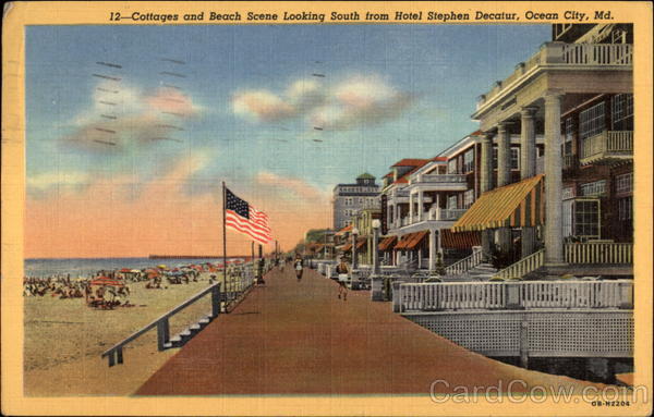 12-Cottages and Beach Scene Looking South from Hotel Stephen Decatur, Ocean City, Md.
