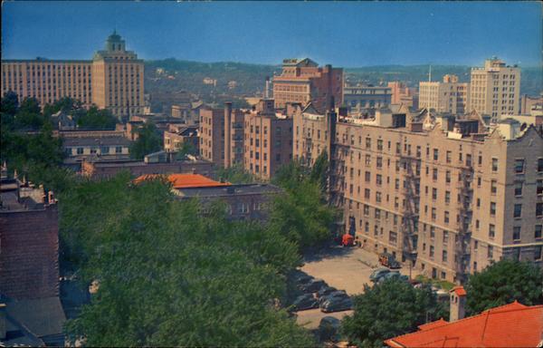 | Looking west from the New York State Armory Building and showing such major buildings as the County Office Building, People's National Bank, Westchester County Courthouse and the New York Telephone Company central office. Battle Hill lies in the background |