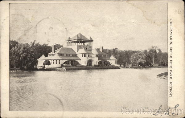 Front: THE PAVILION, BELLE ISLE PARK, DETROIT SAS 11 JULI Back: Poissa ARDNDS 9 30 AM GOR 1905 AU2 05 ONT. Miss Gertrude Grubbe 33 allegheny Car Hand Montigny St. hr. S. of. Ra.