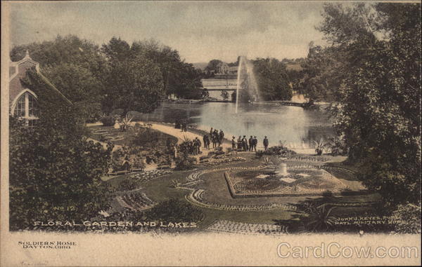 Front: NO 12. FLORAL GARPEN AND LAKES JOXNI, KEYES,Pus NATL MILITARY HOME SOLDIERS' HOME DAYTON.OHIO. Stani-calore Back: Domestic 1 Ct. Foreign 2 Cts. TREIBERTYPGO. MOUKEN