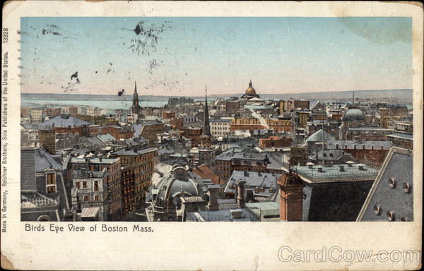 Front: Made in Germany, Reichner Brothers, Sole Publishers of the United States, 13828 Birds Eye View of Boston Mass. WEED Back: UNITED STATE -5 FEBI 2 - PM 19 06 MASS KLIN 1206 CA Ware Loi K Fraudzen dove S c مع هرمهر) as ao % Win Gallia Judan WE