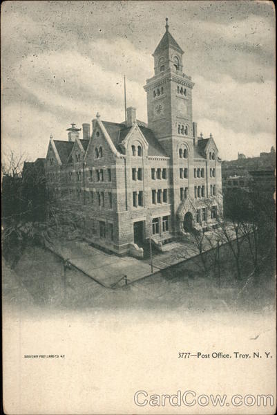 Front: 391. sas ***** SOUVENIR POST CARD CO N.Y 3777—Post Office, Troy, N. Y. Back: 25 cu Post Card-- ---