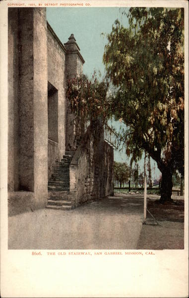 Front: COPYRIGHT, 1904, BY DETROIT PHOTOGRAPHIC CO. 8606. THE OLD STAIRWAY, SAN GABRIEL MISSION, CAL Back: AND CANADA, FOREIGN, Two CENTS.