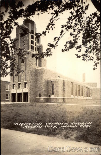 Front: STIGNA TIUS CAT HOLIC CHURCH 7681 ROGERS CITY, MIOH, T6S/ Back: al$ FOST CARD TE ay ALL KAOS LL. COOK CO., MILWAUKES