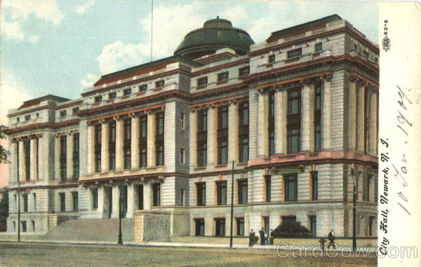 Front: City Hall, Newark, n. I. 10 Jan. 1904. 63-5 Back: JAN 11 930 PM 1909 Place Stam HOSTRAS GALIND Min D. Waldhunger 41 Povrch St. Bere bly. MUS 2-