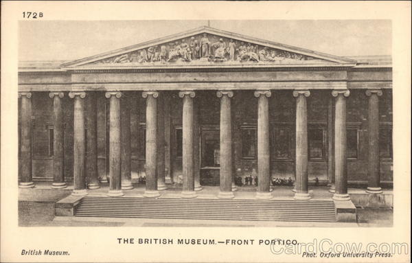 Front: 172 B THE BRITISH MUSEUM.-FRONT PORTICO. British Museum. Phot. Oxford University Press. Back: THIS SPACE MAY BE USED FOR PRINTED OR WRITTEN MATTER