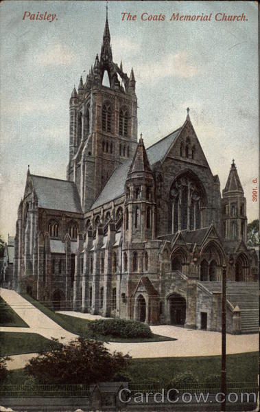 Front: Paisley. The Coats Memorial Church. 3991. 6. Back: I. R walher POST Play CARD Only the TRIDE if sent Abroad. For INLAND Postage only this space may be used for communication. The church Jensmit seing im