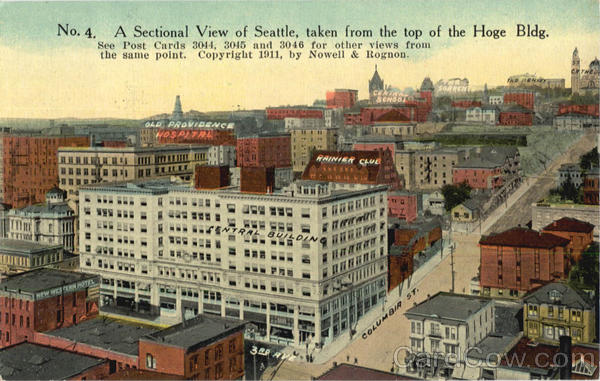 A sectional view of Seattle, taken from the top of the Hoge Bldg. See Post Cards 3044, 3045 and 3046 for other views from the same point. Copyright 1911, by Nowell & Rognon.