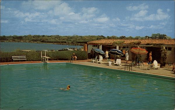 | A view of the swimming pool at the exclusive Southampton Beach Club, showing Lake Agawam in the background. Founded in 1640, this exclusive South Shore community is known for its marvelous bathing beaches, golf courses, tennis, boating and sport fishing. "Come to Southampton for a real vacation" |