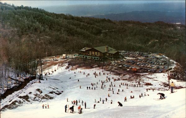 | Skiers on the slopes of Mount Harrison, Ski Lodge in background. The miracle of man-made snow stocks the slopes and the double chair lifts are used by skiers and sightseers. The plush Ski Lodge, ski runs and chair lifts provides a gay and sparkling concept of fun for year 'round vacationers |