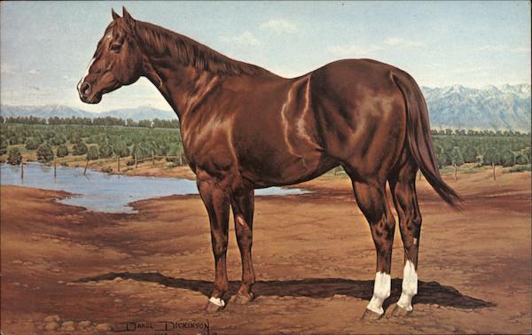 Sire: Nick Shoemaker Dam: Hired Girl. He sired some of the world's greatest halter and performance horses. His blood will always have an impact on the horse world. Bred and owned by Hank Wiescamp, Alamosa, Colorado. From a painting by Darol Dickinson McGraw Color Graphics |