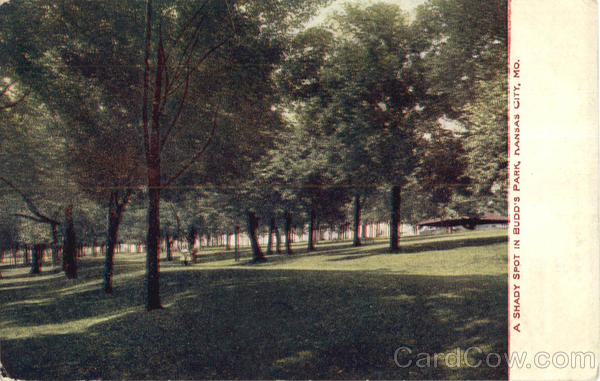 Front: A SHADY SPOT IN BUDD'S PARK, NANSAS CITY, MO. Back: Publ. by Webb-Freyschiag Merc. Co. FOREIGN
