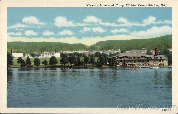Front: View of Lake and Camp Ritchie, Camp Ritchie, Md. 8B571-N Back: THE SHOPPING CENTER, BLUE RIDGE SUMMIT, PA.