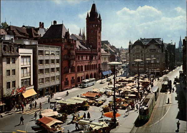 Front: 1131313 17 tre iter CUNI Back: Basel Marktplatz und Rathaus Market Place and Town Hall Place du marché et l'Hôtel de ville Ansichtskarten-Verlag Hans Frey, Basel Reproduktion verboten Fabrication Suisse 502