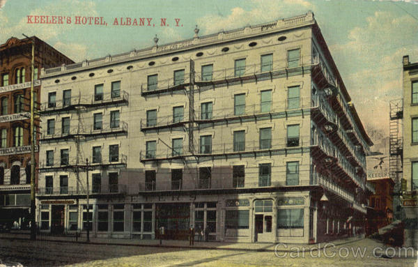 Front: KEELER'S HOTEL, ALBANY, N. Y. NEURS CLO UNKS&TRAVE TRELL LEONA EEES LERS HOT KEELERS Back: 50 THIS SIDE FOR ADDRESS ONLY