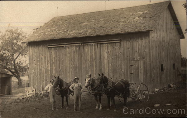Farmers with Horses in Front of Barn