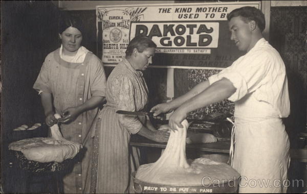 Front: THE KIND MOTHER USED TO B EUREKA RIALCE MILLS DAKOTA GOLD Geld DAEOTA GOL" ACK GUARANTEED TO SATISFY ROLLER MILL KA S. DAKOTA FRED W. HOMEX EURCKA S. REDY TO BE PUTIN PANS Back: 4 75 A A ZO A