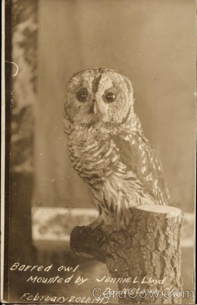 Front: Borred owl. Mounte d by Jennie L Lloyd Doy lestown Obia Febrvary 20th 191) Back: 15 AA 2 A ( N0 OS Α Α 2 ο Α A O Compliments of Mais terminal lloje This card has been in that is why it is so dista my hand bag.
