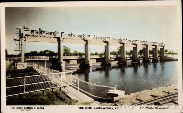 Front: THE ROSE SERIES P. 10026 THE WEIR, YARRAWONGA, VIC. F.H.Wright, Newsagent. COPYRIGHT. Back: The "Rose" Series De Luxe A Real Photograph Produced in Australia Published by the Rose Stereograph Co. Armoddle, Victoria,