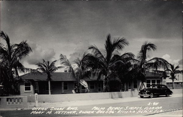 Front: S-911 OCERN SHORE RPTS. MARY M KETTNER, OWNER BOXr586-RIVIERA BERCH, FLA PALM BERCH SHORES, 2ORIDA Back: PECE CORREOS 3 centaras Jeaner Floydand family ud their vacation hue in 1951 apent ALL RIGHTS RVED, THEL. L. COOK CO., MILWAUKEE