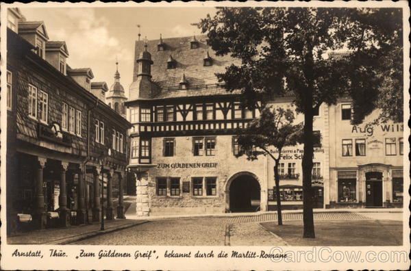 Front: Aug wili WA L IND Buch nderrei a Pap dlung Wege Sprties Felix Sc. d. ZUM GÜLDENEN GREIF Arnstatt, Thür. ,Zum Güldenen Greif, bekannt durch die Marlitt-Romane Back: Kosmos Franch-Verlag Stuttgart-O. Nr. 20086-110 Fotografte Ehte