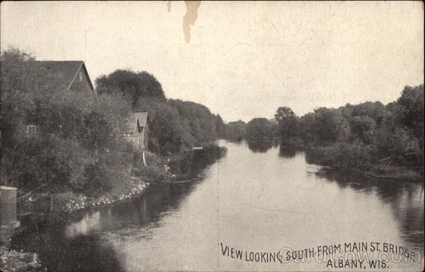 Front: VIEW LOOKING SOUTH FROM MAIN ST. BRIDGE VIEW LOOKING SOUTH FROM MAIN ST. BRIDGE ALBANY, WIS. Back: PLACE THE UNITED STATES, AND MEXICO, 1 CENT. ALL OTHER COUNTRIES, 2 CENTS. FOR THE ADDRESS PUBLISHED BY JNO T. FABER, MILWAUKEE, WIS.