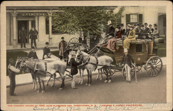 Front: MARTINGE DOS FERY YOUK 30911 THE VINCENT HOUSE IN 1860, NOW FLORENCE INN, TARRYTOWN, N. Y. OGEORGE F. PARKE, PRCPRIETOR. Back: Sackett & Wilhelms Corp., New York and Brooklyn. Printed in U. S. A. THIS SPACE MAY BE USED FOR MESSAGE