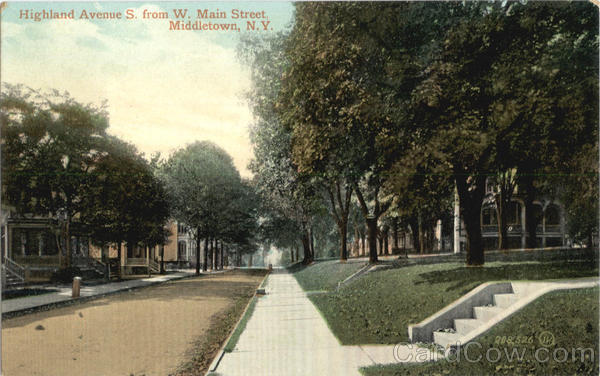 Front: Highland Avenue S. from W. Main Street, Middletown, N. Y. 208526 Back: The Valentine & Sons' Publishing Co., Ltd., New York *Printed in Great Britain. FAMOUS CARD. V1& SONS THROUGHOUT THE WORLD. Address Only.