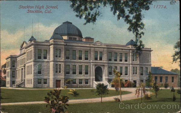 Front: Stockton High School, Stockton, Cal. 11774. Back: 160 APHCO 29 و علماء es SONE W Pub. by The Acmegraph Co., Chicago,