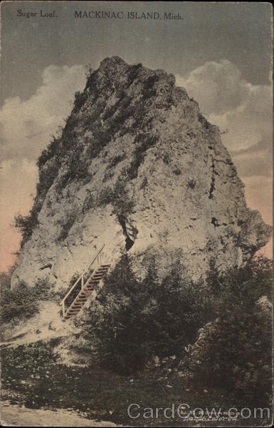 Front: Sugar Loaf. MACKINAC ISLAND, Mich. L.E.EDWARDS, Hand Colored. Back: MIC ever 1CENTI MACH En 1914 VIENAS ud ou Me. me Ted Rooney s Stewart B.C. Lucypead about it Manau Emily Will tell sometime andest toot