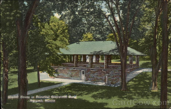 Front: Shelter House in Beautitul Glenwood Perid Macomb, Hiinois Back: Beautiful Glenwood Park is the pride and joy of the people of Macomb, Illinois. 4C269-N GENUINE CURTEICH.CHICAGO 'C.T. AMERICAN ART' POST CARD (REG. U.S. PAT. OFF.)