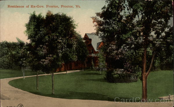 Front: Residence of Ex-Gov. Proctor, Proctor, Vt. Back: Published by the Valentine & Sons' Publishing Co. New York and Boston. M. C. THROUGHOUT THE WORLD. V. "SONS FAMOUS CARD.