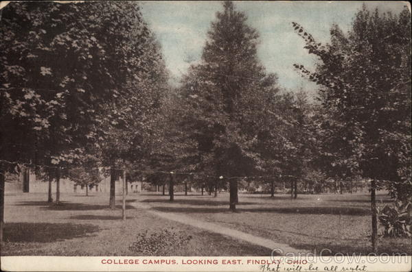 Front: COLLEGE CAMPUS, LOOKING EAST, FINDLAY, OHIO That will le all riglat, Back: SIDEN Post Gard SER 22 Wu Curus PA Made by Thomas & Co., Findlay, Ohio Miss Ella N. Brown, Hoodbury