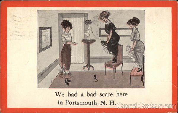 Front: We had a bad scare here in Portsmouth, N. H. Back: S POST GARD LISMO 30A T.P. & CO. NH Kiss nill come unch 락 C. de trick Roca Becker eynid. Ilzinaing bath Neissefalia here hase N. ere to call from MR. are all en C. Series 802x