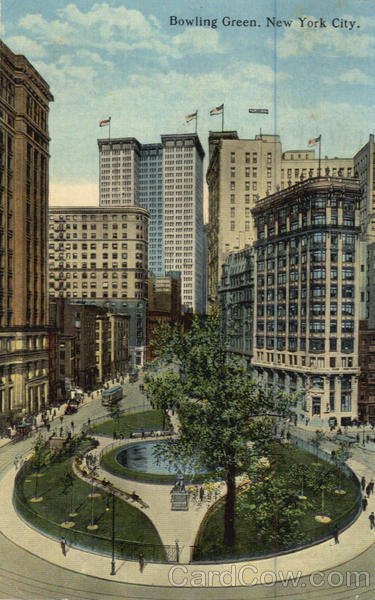 The Bowling Green is located at the foot of Broadway and is the city's oldest park. In 1626 it was used as a drill ground in front of Fort Amsterdam. In 1776 an equestrian statue made of lead of King George III was set up in the center of Bowling Green but on July 9th of the year it was torn down and made into bullets for the use of patriots. It is now the center of the most important business district in the city |