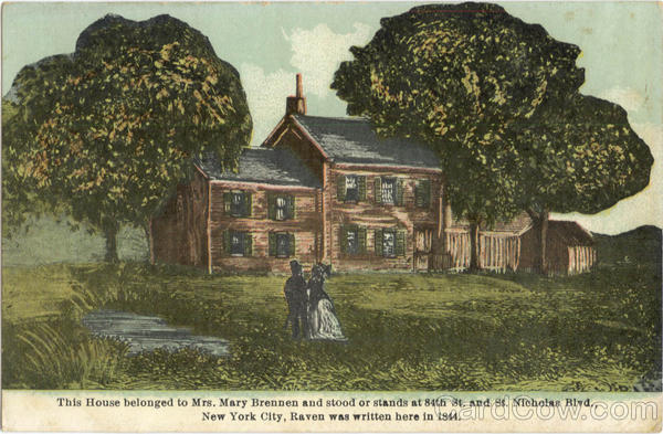 Front: This House belonged to Mrs. Mary Brennen and stood or stands at 84th St. and St. Nicholas Blvd., New York City, Raven was written here in 1844. Back: TWO CENTS