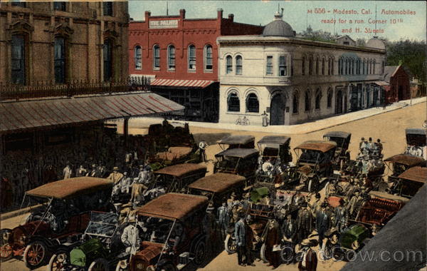 Front: M 556 - Modesto, Cal. Automobiles ready for a run. Corner 10 th and H. Streets THE PALMER Back: POST CARD. . P:N 1c QUALITY SERIES 2 c Pub. by Pacific Novelty Co. of San Francisco, Calif.
