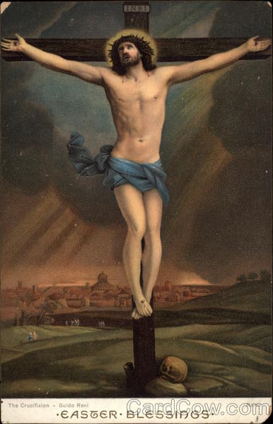 Front: INRI The Crucifixion Guido Reni Rome ·EASTER·BLESSINGS• Back: HALFPENNY REGISTERED WRITE HERE (INLAND USE ONLY) MISCH & Co's "World's Galleries”. Series No. 1089 (29801)