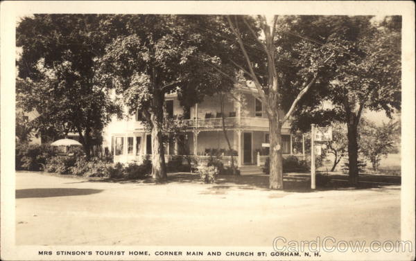 Front: TOURISTS MRS STINSON'S T OURIST HOME, CORNER MAIN AND CHURCH ST; GORHAM, N, H, Back: SHO THL AMONG WHITE HILLS STUDIO STABAP NH