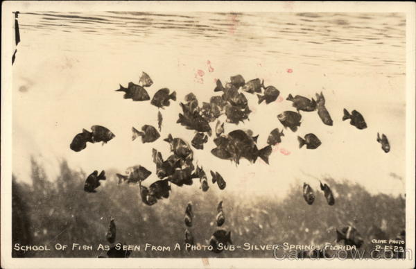 Front: CLINE PHOTO 2-E-23 SCHOOL OF FISH AS SEEN FROM A PHÔTO SUB-SILVER SPRINGS, FLORIDA Back: POST CAR