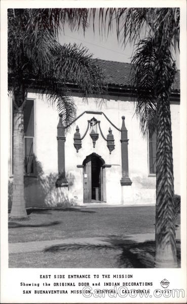 Front: EAST SIDE ENTRANCE TO THE MISSI ON Showing the ORIGINAL DOOR and INDIAN DECORATIONS SAN BUENAVENTURA MISS ION, VENTURA, CALIFORN I A W - 1 3 1 7 Back: FUBLISHED BY FRASHERS, INC, PC MONA, CALIF. , ,