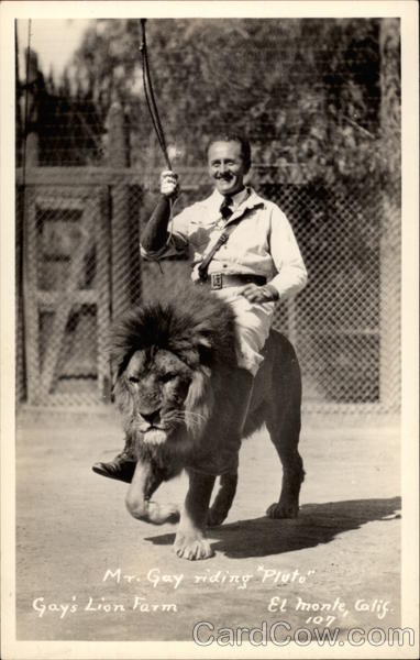 Mr. Gay riding "Pluto", Gay's Lion Farm
