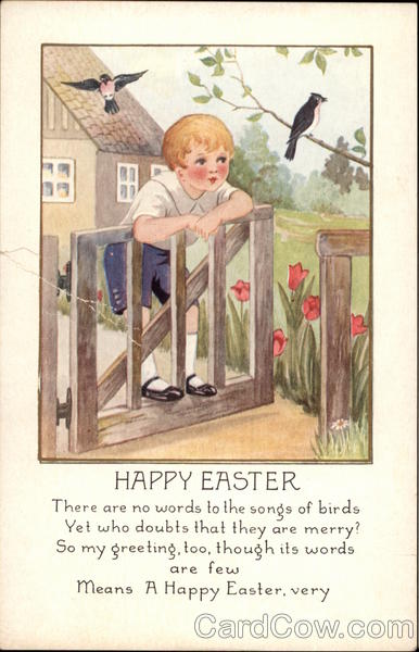Front: HAPPY EASTER There are no words to the songs of birds Yet who doubts that they are merry? So my greeting, too, though its words are few Means A Happy Easter, very Back: ZA-100 hitney Whois Jade Jorcester Llass. MADE IN USA
