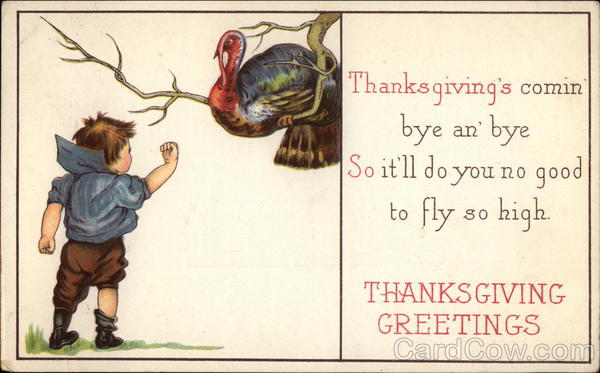 Front: Thanksgiving's bye an' bye So it'll do you no good comin to fly so high. THANKSGIVING GREETINGS Back: FOR ADDRESS CONLYIM 1916 СА. from the Palin Kidies Martü Raher Hodge Robert Rrallo Cal Series 54 A