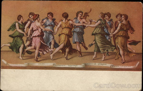Front: TOAVE YM EY7EKEL MEAXOMEYH 7EQHIXOQH Back: Domestic and PublĂshed by COMMERCIAL COLORTYPE CO. [Not Inc.] 3-Color Process Plate Makers, Chicago. La Danza D’Apollo Con Le Muse Firenze Giulio Romano No. 101